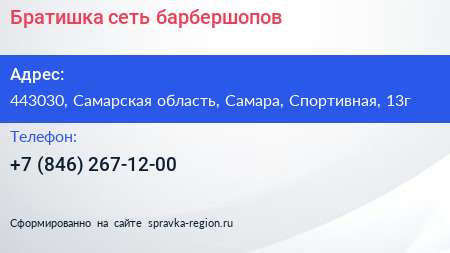 Братишка, сеть барбершопов по адресу 443030, Самарская область, Самара, Спортивная, 13г в дальнейшем Организация, размещена в следующих категориях: