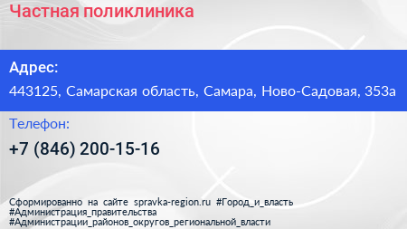 Частная поликлиника по адресу 443125, Самарская область, Самара, Ново-Садовая, 353а в дальнейшем Организация, размещена в следующих категориях: