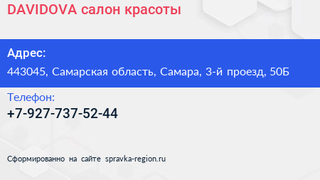 DAVIDOVA, салон красоты по адресу 443045, Самарская область, Самара, 3-й проезд, 50Б в дальнейшем Организация, размещена в следующих категориях:
