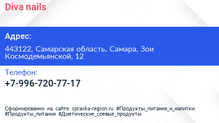 Diva-nails по адресу 443122, Самарская область, Самара, Зои Космодемьянской, 12 в дальнейшем Организация, размещена в следующих категориях: