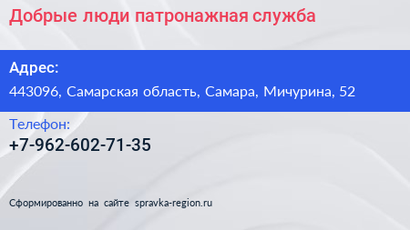 Добрые люди, патронажная служба по адресу 443096, Самарская область, Самара, Мичурина, 52 в дальнейшем Организация, размещена в следующих категориях: