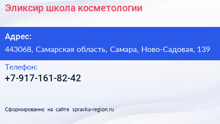 Эликсир, школа косметологии по адресу 443068, Самарская область, Самара, Ново-Садовая, 139 в дальнейшем Организация, размещена в следующих категориях: