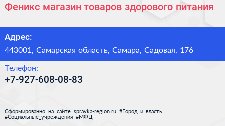 Феникс, магазин товаров здорового питания по адресу 443001, Самарская область, Самара, Садовая, 176 в дальнейшем Организация, размещена в следующих категориях: