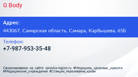 G-Body по адресу 443067, Самарская область, Самара, Карбышева, 65Б в дальнейшем Организация, размещена в следующих категориях: