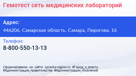 Гемотест, сеть медицинских лабораторий по адресу 446206, Самарская область, Самара, Пирогова, 16 в дальнейшем Организация, размещена в следующих категориях:
