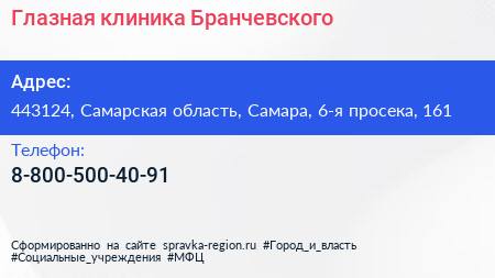 Глазная клиника Бранчевского по адресу 443124, Самарская область, Самара, 6-я просека, 161 в дальнейшем Организация, размещена в следующих категориях:
