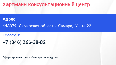 Хартманн, консультационный центр по адресу 443079, Самарская область, Самара, Мяги, 22 в дальнейшем Организация, размещена в следующих категориях: