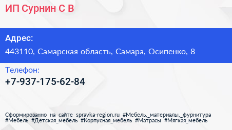ИП Сурнин С.В. по адресу 443110, Самарская область, Самара, Осипенко, 8 в дальнейшем Организация, размещена в следующих категориях: