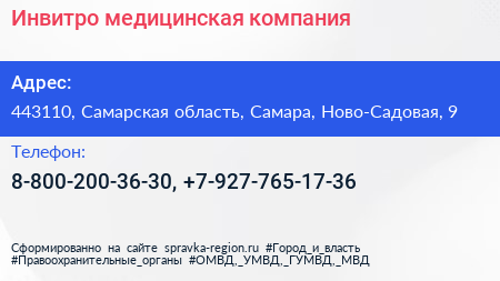 Инвитро, медицинская компания по адресу 443110, Самарская область, Самара, Ново-Садовая, 9 в дальнейшем Организация, размещена в следующих категориях:
