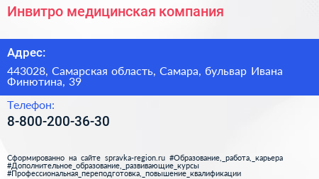 Инвитро, медицинская компания по адресу 443028, Самарская область, Самара, бульвар Ивана Финютина, 39 в дальнейшем Организация, размещена в следующих категориях: