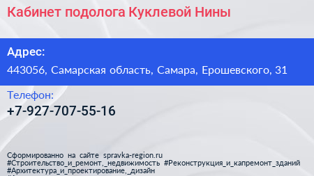 Кабинет подолога Куклевой Нины по адресу 443056, Самарская область, Самара, Ерошевского, 31 в дальнейшем Организация, размещена в следующих категориях: