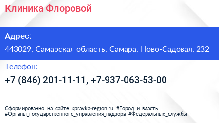 Клиника Флоровой по адресу 443029, Самарская область, Самара, Ново-Садовая, 232 в дальнейшем Организация, размещена в следующих категориях: