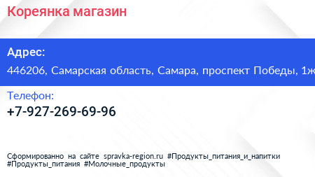 Кореянка, магазин по адресу 446206, Самарская область, Самара, проспект Победы, 1ж в дальнейшем Организация, размещена в следующих категориях: