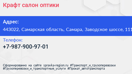 Крафт, салон оптики по адресу 443022, Самарская область, Самара, Заводское шоссе, 111 в дальнейшем Организация, размещена в следующих категориях: