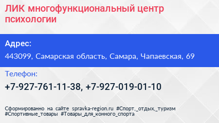 ЛИК, многофункциональный центр психологии по адресу 443099, Самарская область, Самара, Чапаевская, 69 в дальнейшем Организация, размещена в следующих категориях: