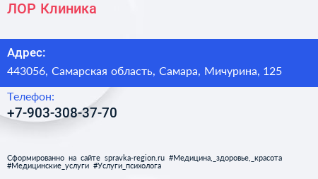 ЛОР-Клиника по адресу 443056, Самарская область, Самара, Мичурина, 125 в дальнейшем Организация, размещена в следующих категориях: