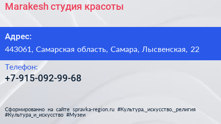 Marakesh, студия красоты по адресу 443061, Самарская область, Самара, Лысвенская, 22 в дальнейшем Организация, размещена в следующих категориях:
