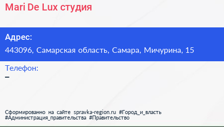 Mari De Lux, студия по адресу 443096, Самарская область, Самара, Мичурина, 15 в дальнейшем Организация, размещена в следующих категориях: