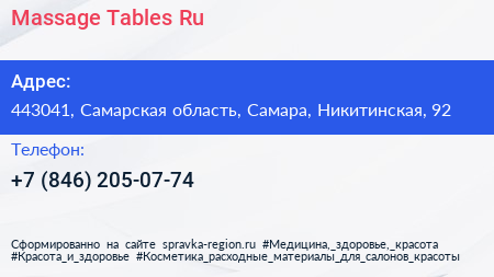 Massage-Tables.Ru по адресу 443041, Самарская область, Самара, Никитинская, 92 в дальнейшем Организация, размещена в следующих категориях: