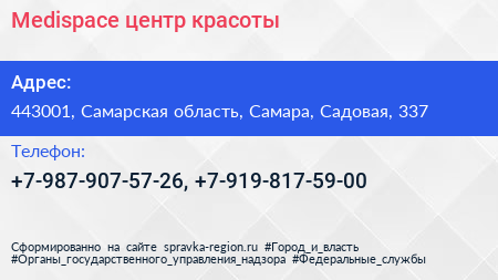 Medispace, центр красоты по адресу 443001, Самарская область, Самара, Садовая, 337 в дальнейшем Организация, размещена в следующих категориях: