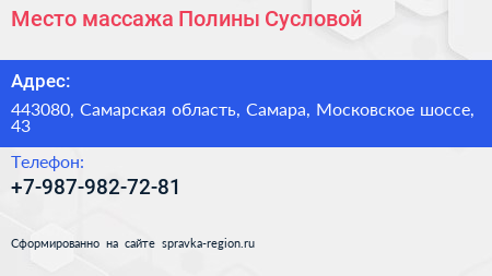 Место массажа Полины Сусловой по адресу 443080, Самарская область, Самара, Московское шоссе, 43 в дальнейшем Организация, размещена в следующих категориях: