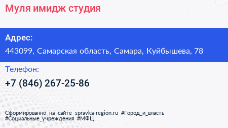 Муля, имидж-студия по адресу 443099, Самарская область, Самара, Куйбышева, 78 в дальнейшем Организация, размещена в следующих категориях: