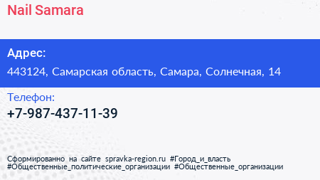 Nail Samara по адресу 443124, Самарская область, Самара, Солнечная, 14 в дальнейшем Организация, размещена в следующих категориях: