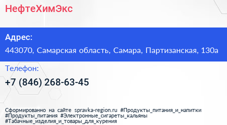 НефтеХимЭкс по адресу 443070, Самарская область, Самара, Партизанская, 130а в дальнейшем Организация, размещена в следующих категориях: