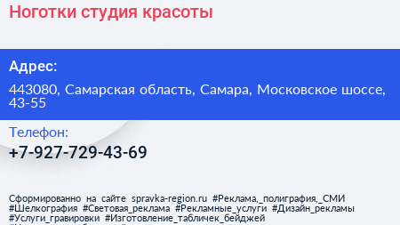 Ноготки, студия красоты по адресу 443080, Самарская область, Самара, Московское шоссе, 43-55 в дальнейшем Организация, размещена в следующих категориях: