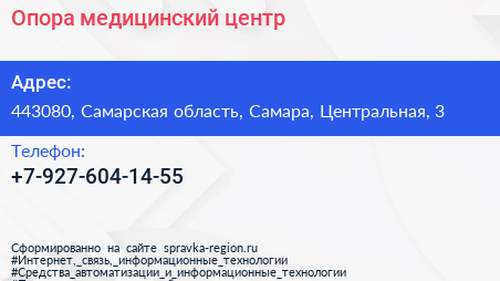Опора, медицинский центр по адресу 443080, Самарская область, Самара, Центральная, 3 в дальнейшем Организация, размещена в следующих категориях: