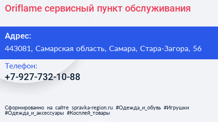 Oriflame, сервисный пункт обслуживания по адресу 443081, Самарская область, Самара, Стара-Загора, 56 в дальнейшем Организация, размещена в следующих категориях: