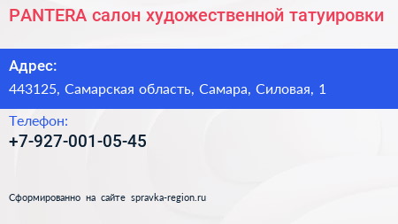 PANTERA, салон художественной татуировки по адресу 443125, Самарская область, Самара, Силовая, 1 в дальнейшем Организация, размещена в следующих категориях: