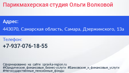 Парикмахерская студия Ольги Волковой по адресу 443070, Самарская область, Самара, Дзержинского, 13а в дальнейшем Организация, размещена в следующих категориях: