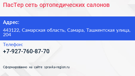 ПасТер, сеть ортопедических салонов по адресу 443122, Самарская область, Самара, Ташкентская улица, 204 в дальнейшем Организация, размещена в следующих категориях: