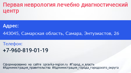 Первая неврология, лечебно-диагностический центр по адресу 443045, Самарская область, Самара, Энтузиастов, 26 в дальнейшем Организация, размещена в следующих категориях: