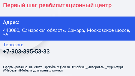 Первый шаг, реабилитационный центр по адресу 443080, Самарская область, Самара, Московское шоссе, 55 в дальнейшем Организация, размещена в следующих категориях: