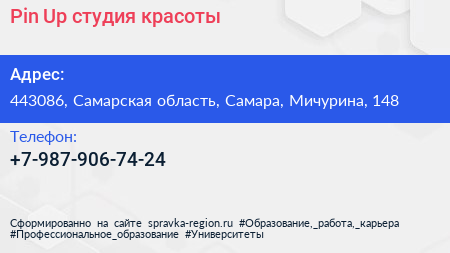 Pin Up, студия красоты по адресу 443086, Самарская область, Самара, Мичурина, 148 в дальнейшем Организация, размещена в следующих категориях:
