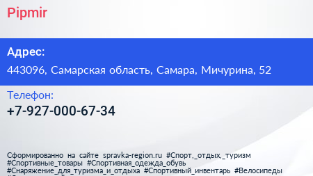 Pipmir по адресу 443096, Самарская область, Самара, Мичурина, 52 в дальнейшем Организация, размещена в следующих категориях: