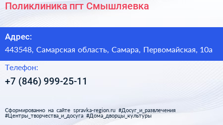 Поликлиника, пгт. Смышляевка по адресу 443548, Самарская область, Самара, Первомайская, 10а в дальнейшем Организация, размещена в следующих категориях: