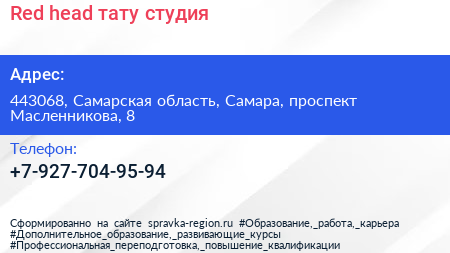 Red head, тату-студия по адресу 443068, Самарская область, Самара, проспект Масленникова, 8 в дальнейшем Организация, размещена в следующих категориях: