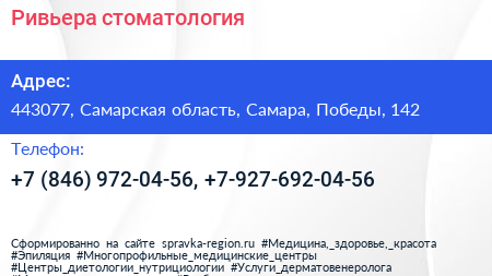 Ривьера, стоматология по адресу 443077, Самарская область, Самара, Победы, 142 в дальнейшем Организация, размещена в следующих категориях: