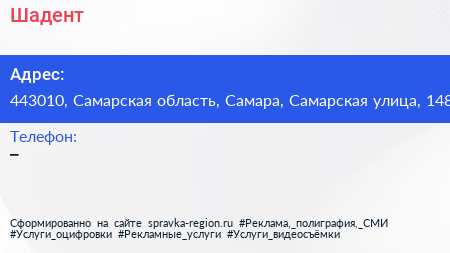 Шадент по адресу 443010, Самарская область, Самара, Самарская улица, 148 в дальнейшем Организация, размещена в следующих категориях: