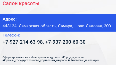 Салон красоты по адресу 443124, Самарская область, Самара, Ново-Садовая, 200 в дальнейшем Организация, размещена в следующих категориях: