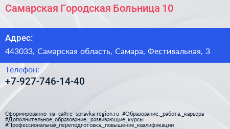 Самарская Городская Больница № 10 по адресу 443033, Самарская область, Самара, Фестивальная, 3 в дальнейшем Организация, размещена в следующих категориях: