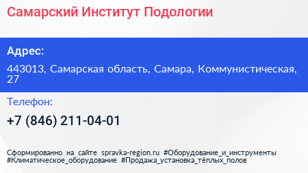 Самарский Институт Подологии по адресу 443013, Самарская область, Самара, Коммунистическая, 27 в дальнейшем Организация, размещена в следующих категориях: