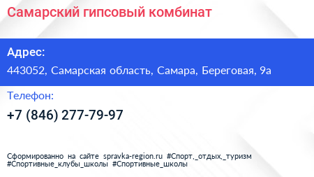 Самарский гипсовый комбинат по адресу 443052, Самарская область, Самара, Береговая, 9а в дальнейшем Организация, размещена в следующих категориях: