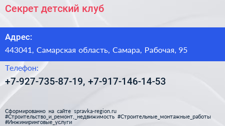 Секрет, детский клуб по адресу 443041, Самарская область, Самара, Рабочая, 95 в дальнейшем Организация, размещена в следующих категориях: