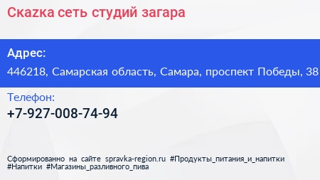 Скаzка, сеть студий загара по адресу 446218, Самарская область, Самара, проспект Победы, 38 в дальнейшем Организация, размещена в следующих категориях: