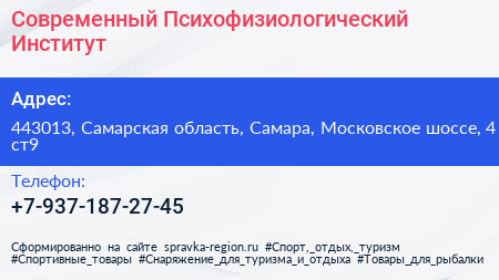 Современный Психофизиологический Институт по адресу 443013, Самарская область, Самара, Московское шоссе, 4 ст9 в дальнейшем Организация, размещена в следующих категориях: