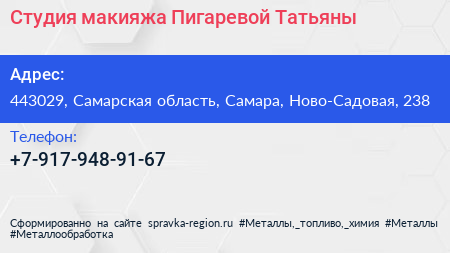 Студия макияжа Пигаревой Татьяны по адресу 443029, Самарская область, Самара, Ново-Садовая, 238 в дальнейшем Организация, размещена в следующих категориях: